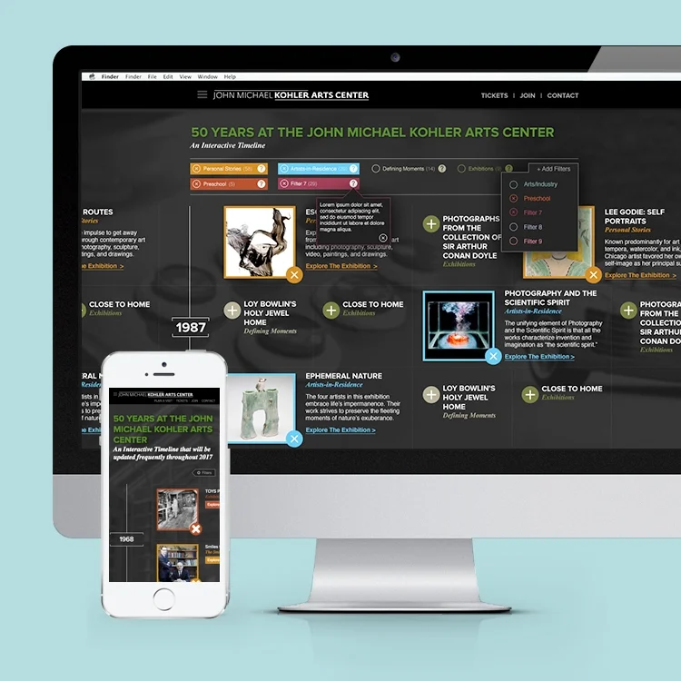 Project Description: John Michael Kohler Center for the Arts is a gallery space which aims to bring art to the residents of Wisconsin. As such, they required an interactive timeline that could demonstrate the Center's commitment to their vision over the last 50 years. The interactive timeline exists in the gallery on a 32 inch screen, as well as on their website. The timeline features swiping interactions on the touch screens and click and drag on desktop. There are also several filters that can be applied to narrow down the the nodes on the 50-year timeline.
